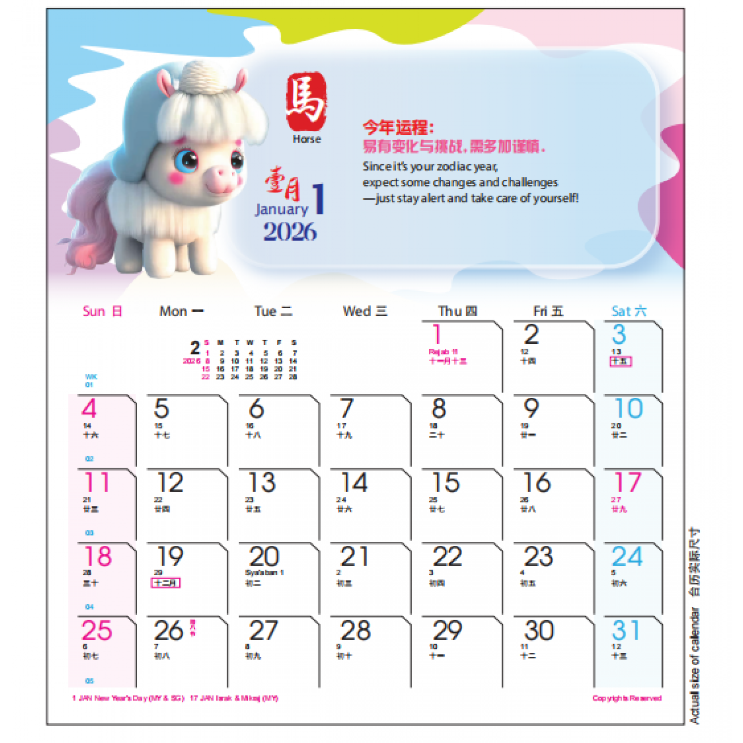- Includes Malaysia & Singapore Public Holidays 包含马来西亚与新加坡公共假期,实用与美观兼具